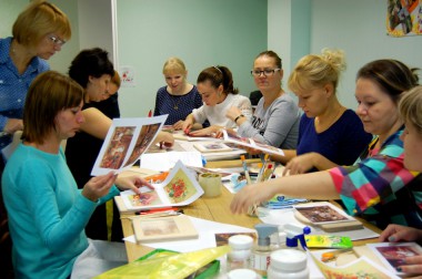 Затем Н.Бережная раздала каждой ученице заготовку из фанеры, которую девушки покрывали морилкой. Далее грунтовали, расслаивали распечатку-картинку и наклеивали её на заготовку, потом несколько раз покрывали акриловым лаком.