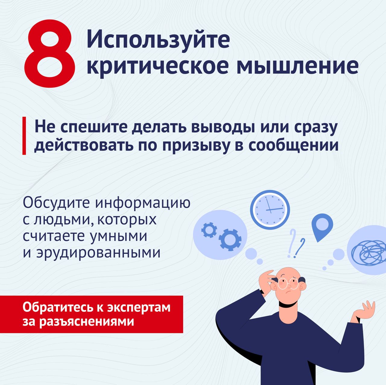 9. Думайте критически. Эмоции — плохой советчик. Остановитесь, подумайте, обсудите.