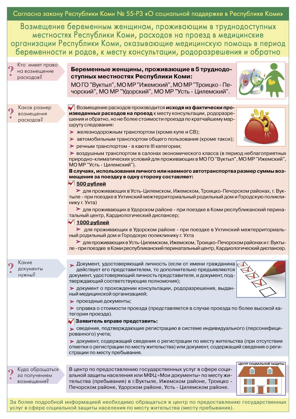 В Министерстве труда, занятости и социальной защиты Республики Коми напомнили: беременные женщины Вуктыла, Ижемского, Усть-Цилемского, Удорского и Троицко-Печорского районов могут получить возмещение расходов на проезд в государственные учреждения здравоохранения региона, которые оказывают медицинскую помощь в период беременности и родов. Законодательством такими учреждениями определены Коми республиканский перинатальный центр, Кардиологический диспансер, а также Ухтинский межтерриториальный родильный дом и Городская поликлиника г.Ухты.