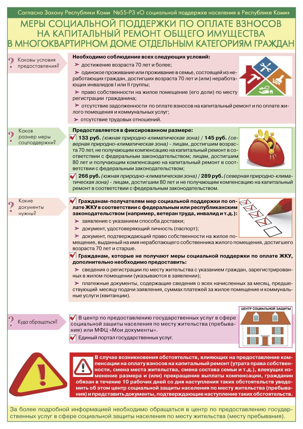 «Льготы по оплате взносов на капитальный ремонт носят компенсационный характер и предоставляются Центрами социальной защиты населения по месту жительства граждан. Компенсация предоставляется при отсутствии задолженности по оплате ЖКУ или при заключении соглашения с организациями, предоставляющими жилищно-коммунальные услуги населению, по ее погашению», – отметили в Минтруде Коми.