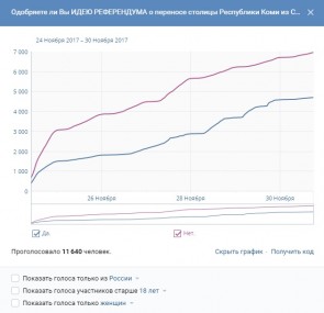 Пользователям сети "ВКонтакте" было предложено высказать свое мнение по следующему вопросу: "Одобряете ли вы идею референдума о переносе столицы Республики Коми из Сыктывкара в Ухту?"
