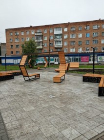 В рамках проекта были установлены новые бортовые камни и уложена современная тротуарная плитка, установлено освещение. Также на объекте появились и новые объекты: фигура топиарии «Медведица с медвежонком», беседки и скамейки.