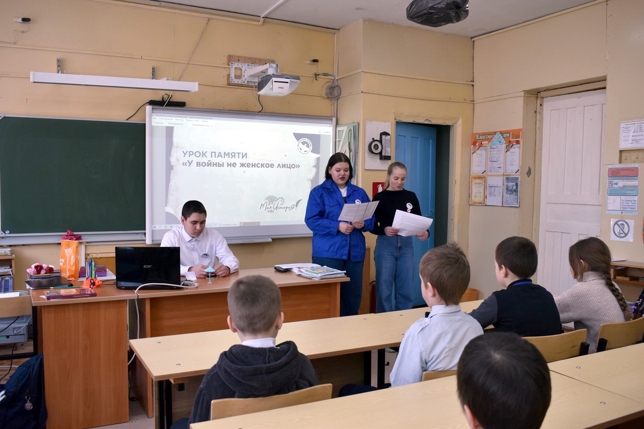 В преддверии весеннего женского праздника Волонтеры Победы Вуктыла провели для обучающихся МБОУ «СОШ №2 им. Г. В. Кравченко» Всероссийский урок памяти на тему «У войны не женское лицо», посвященный женщинам – героям Великой Отечественной войны. Методические рекомендации для проведения урока разработаны Всероссийским общественным движением «Волонтеры Победы».